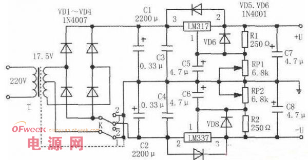LM317及LM337的引腳功能見圖2。本電路中所有電容均選用耐壓大于50V的元器件。兩個三端可調穩壓塊的功耗約15W左右。